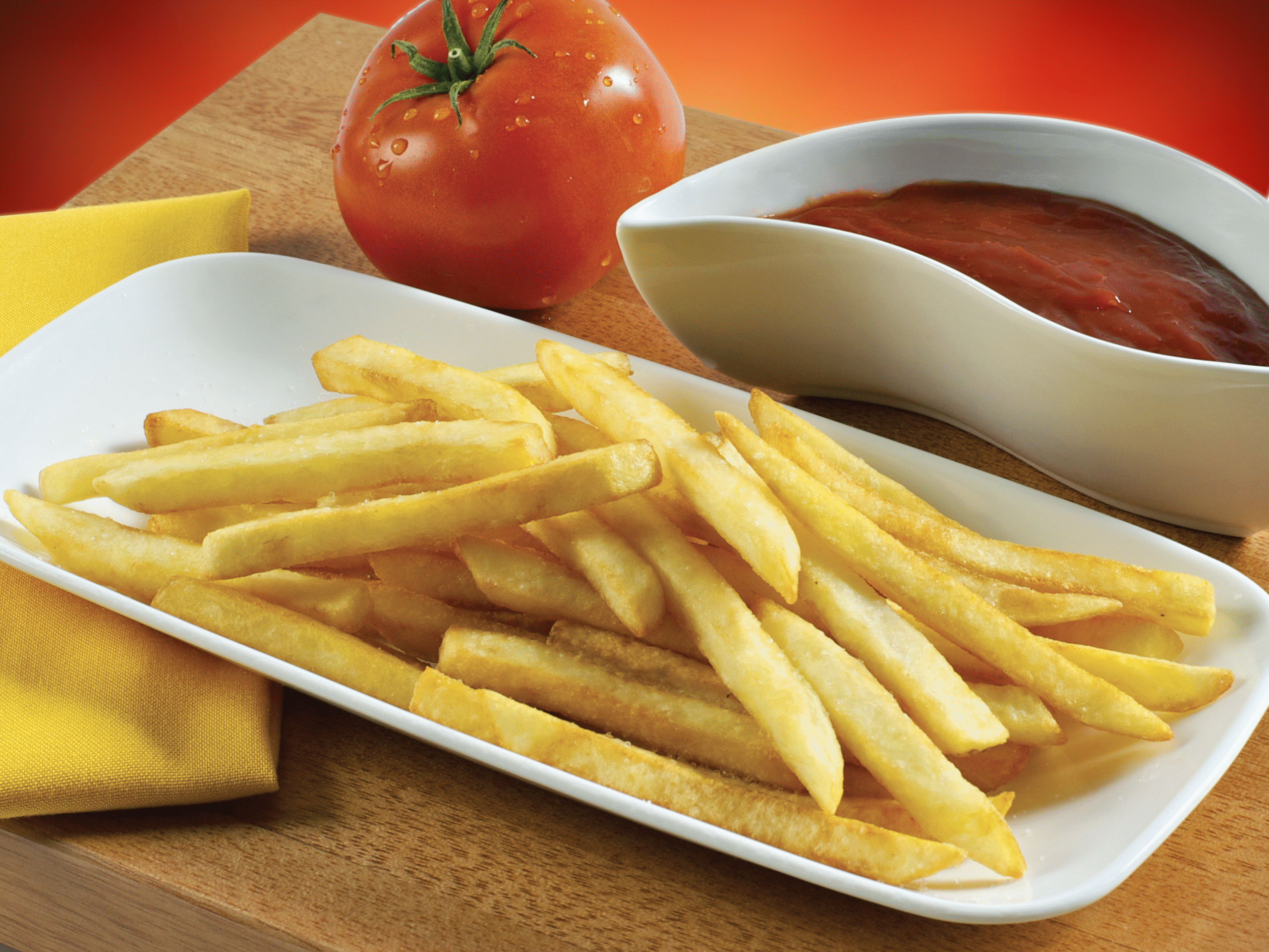 Papas a la francesa crujientes y doradas. Servidas con nuestra clásica porción de catsup de la casa.