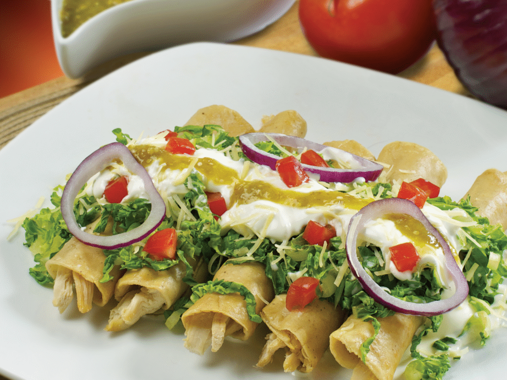 Orden de 5 tacos dorados al momento, rellenos de nuestro delicioso pollo. Acompañados de lechuga fresca, tomate, crema, queso rallado, cebolla morada curtida y nuestra salsita verde.